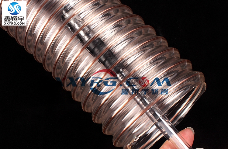 pu通風吸塵鋼絲軟管具有較強的耐磨特性,輕型,具有一定的伸縮性和壓縮比,可(kě)排靜電,可定做阻燃型、食品級軟管