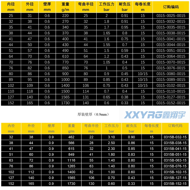 內徑 | 重量 | 工作壓力 | 耐負壓 | 彎曲半(bàn)徑 | 每卷長度 | 訂購編(biān)碼 |