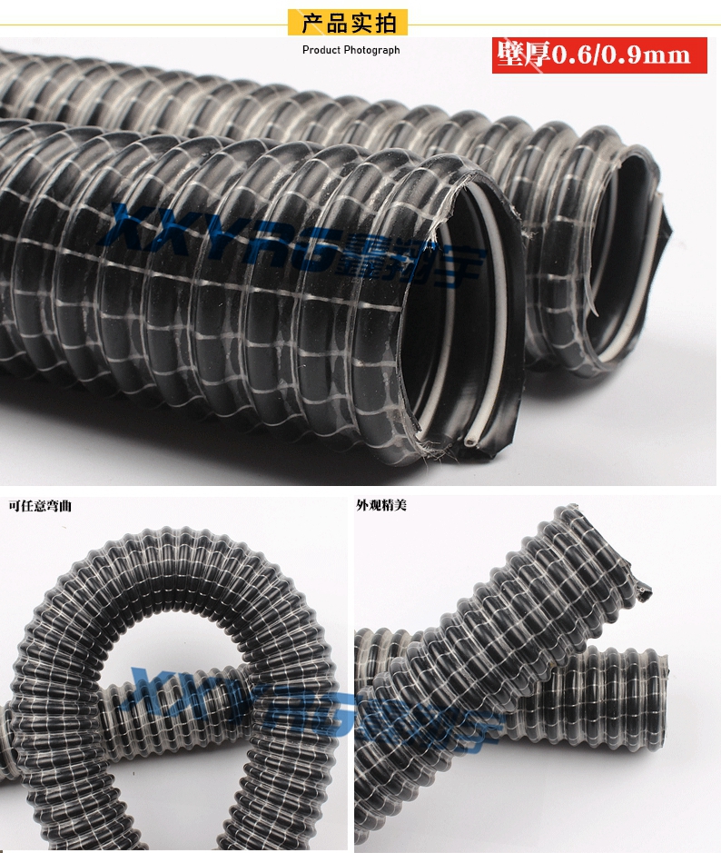 原料: 管壁:柔軟PVC, 螺旋(xuán)絲:硬質(zhì)PVC;